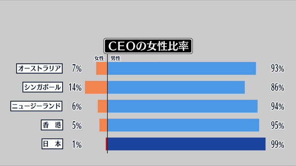 リーダーシップ層の女性比率の低さはとりわけ深刻で、CEO(最高経営責任者)が女性の企業は1位のシンガポールで14%だったのに対し、最下位の日本では1%にも届きませんでした。