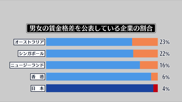 2つ目は、賃金格差です。男女の賃金格差のデータを公表している企業の割合は、1位・オーストラリア23%、2位・シンガポール22%、3位・ニュージーランド16%、4位・香港6%、5位・日本4%となり、日本企業は情報開示が遅れていることがわかりました。